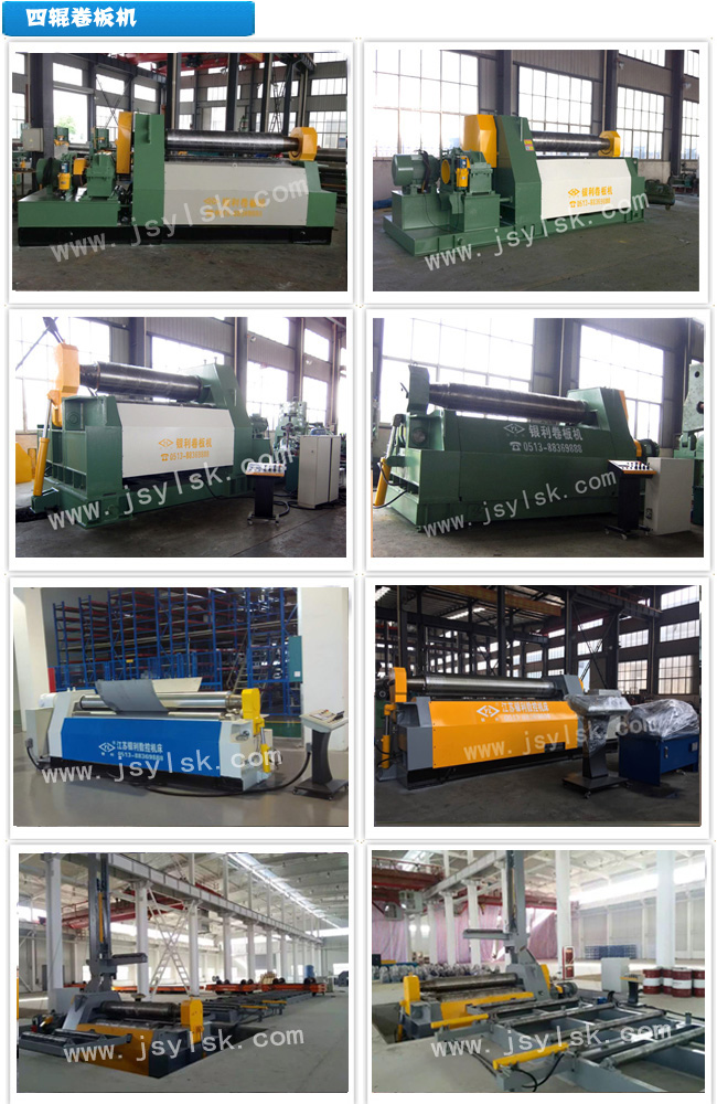 该机结构型式四辊式,上辊为主传动,通过减速机的输出齿轮与上辊齿轮啮合,为卷制板材提供扭矩;下辊作垂直升降运动,通过液压缸内的液压油作用于活塞而获得,以便夹紧板材,为液压传动;在下辊的两侧设有侧辊并沿着机架导轨作倾运动,通过丝杆丝母蜗轮蜗杆传动;该机优点是板材端部预弯及卷圆可以在同一台设备上进行。