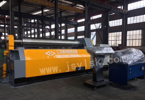 该机结构型式四辊式,上辊为主传动,通过减速机的输出齿轮与上辊齿轮啮合,为卷制板材提供扭矩;下辊作垂直升降运动,通过液压缸内的液压油作用于活塞而获得,以便夹紧板材,为液压传动;在下辊的两侧设有侧辊并沿着机架导轨作倾运动,通过丝杆丝母蜗轮蜗杆传动;该机优点是板材端部预弯及卷圆可以在同一台设备上进行。